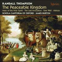 Thompson designed these works to be gracious for the singer and accessible for his audiences, writing mainly conjunct vocal lines and employing part-writing and voice-leading principles derived from models of both sixteenth- and eighteenth-century polyphony. Avant-garde developments and experiments in vocal-writing held no interest for him—in a speech given in 1959 extolling composers to write for amateur choruses he expressed his opinion that contemporary compositional techniques involving irregular rhythms and a pervasive use of dissonance and chromaticism were less than suitable for choral music. Thompson was content instead in expressing his musical ideas through more traditional, time-tested and conventional means. Within these self-imposed constructs he was able to compose choral works that are marked by skilful craftsmanship, a pervasive singability and uncommon beauty. This new Hyperion recording by the excellent Schola Cantorum of Oxford, conducted by James Burton, features Thompson’s The Peaceable Kingdom, based upon religious texts drawn from the book of Isaiah, as well as his Mass, Alleluia, The Last Invocation and Fare Well.